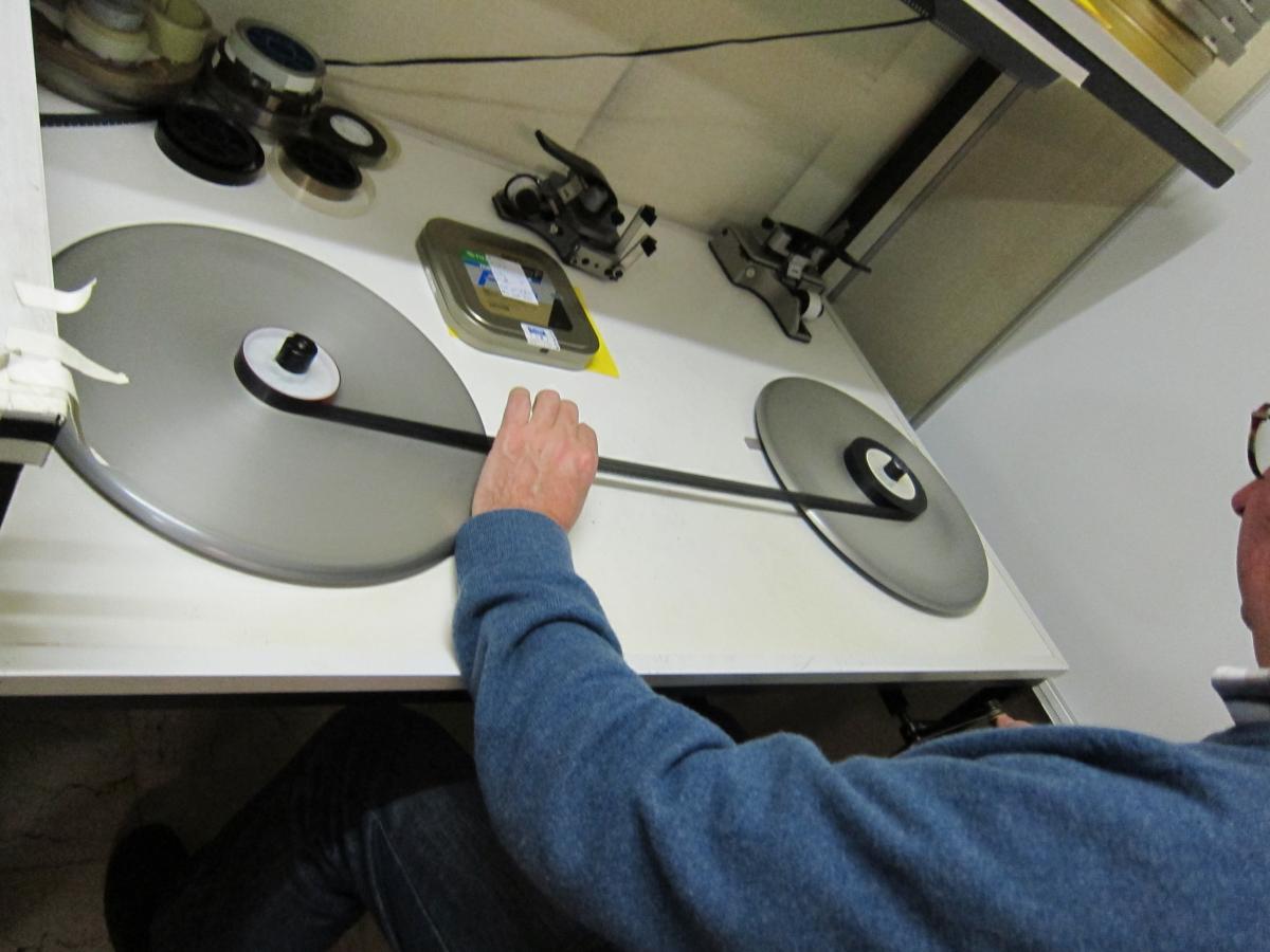 Na het aanplakken van een aanloopstrook – die voor bescherming zorgt bij het inleiden – gebeurde een controle van de film, gevolgd door een reiniging in de machine. De film werd vervolgens manueel (tussen de vingertoppen) gecontroleerd op scheurtjes en perforaties (zie Afbeelding 7). Een eventuele herstelling van slechte lassen bleek niet nodig. Er werd een extra aanloopstrook aangezet (zie Afbeelding 8). Tenslotte werd de film op de montagetafel bekeken om de scan (inhoud, ondertitels, begin-einde) te bepalen.